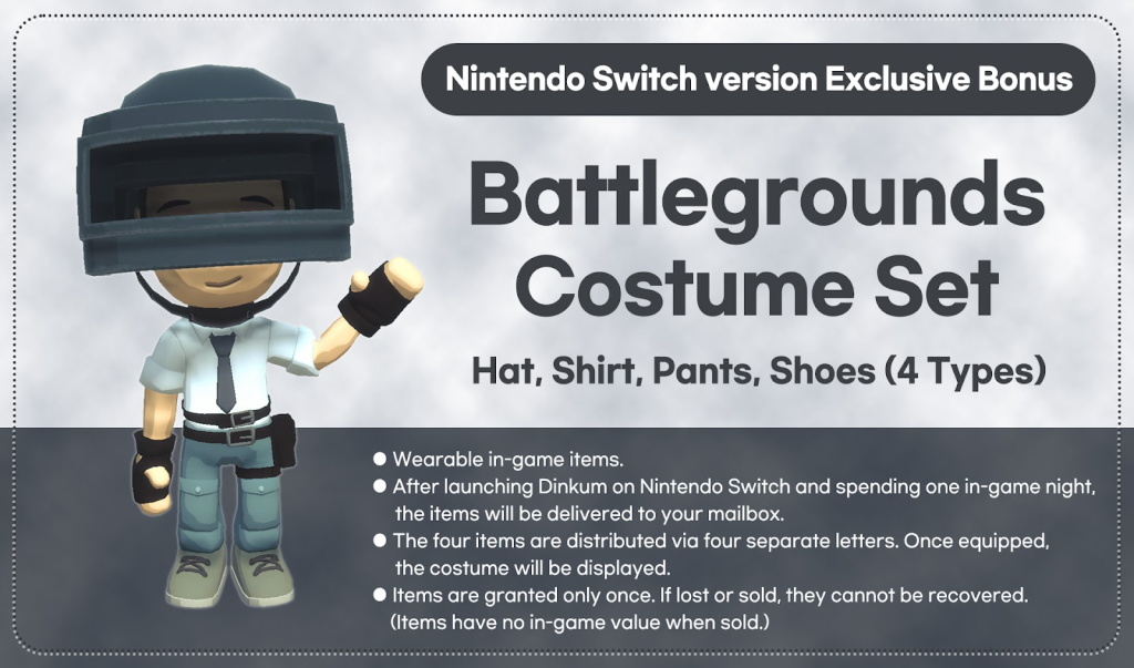 - Set de Disfraz Battlegrounds – cuatro piezas de vestuario que se entregan en el buzón del juego tras pasar la primera noche en Dinkum.