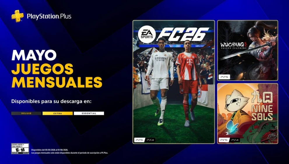 La línea de juegos mensuales en PlayStation Plus de mayo incluye tres juegos disponibles para todos los miembros de PlayStation Plus. Demuestra tus habilidades en el campo de juego de EA Sports FC 26, lucha contra monstruos en Wuchang: Fallen Feathers y ábrete paso en un mundo 2D en Nine Sols. Disponibles a contar del 5 de mayo.